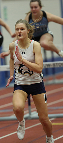 Head UW-Stout coach Kyle Steiner and his staff hosted 18 teams at the Northern Badger Classic Large School Meet. Osceola edged La Crosse Logan for the team title 50.5 to 49.5 closely followed by River Falls [49], Amery [48], and New Richmond [46]. In the photo above Osceola's Hattie Fox is shown taking an early lead in the finals of the 55 meter high hurdles followed by Minnesota hurdlers Brooke Cina [Totino-Grace, 2nd], and Rochester Mayo's Jadyn Lester [3rd]. |