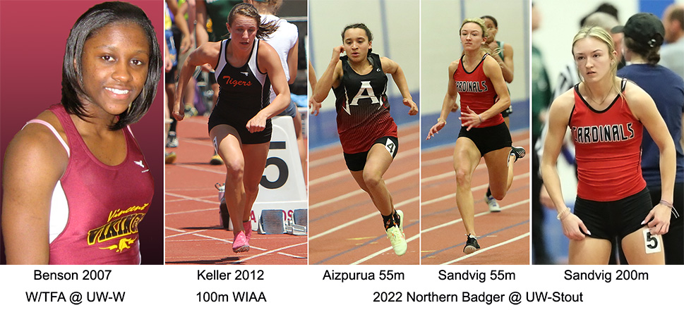 | 55m dash runners L-R: Rebecca Randleman [River Falls, 5th], Luciana Aizpurua [Amery, 2nd, 7.16], winner and record setter Brooklyn Sandvig [Chippewa Falls, 7.00], Julie Yang [La Crosse Logan, 3rd], and La Crosse Logan's Lauren Jarrett [4th]. Sandvig broke the meet record [2012, Kat Keller-New Richmond, 7.17] and the facility record [Ashante Benson - Minnesota State-Winona, 7.16 in 2009. Benson was a former Milwaukee Vincent athlete]. | ||