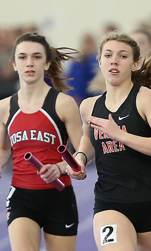 | The Spartans of West Bend West won the 4x4 in 4:14.92. they were followed by Verona Area [4:15.21], Dodgeland [4:15.59], Wauwatosa East, Germantown, and Kenosha Indian Trail. Dodgeland anchor Mirandi Firari had a busy day also medaling in the 60m dash and placing 7th in the pole vault. Firari had a terrific leg 4 run helping her team to the Bronze Medal in the 4x4. Thirty 4x4 teams ran in the last event of the meet. | ||